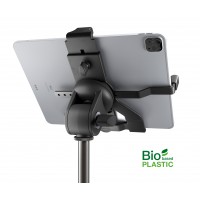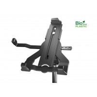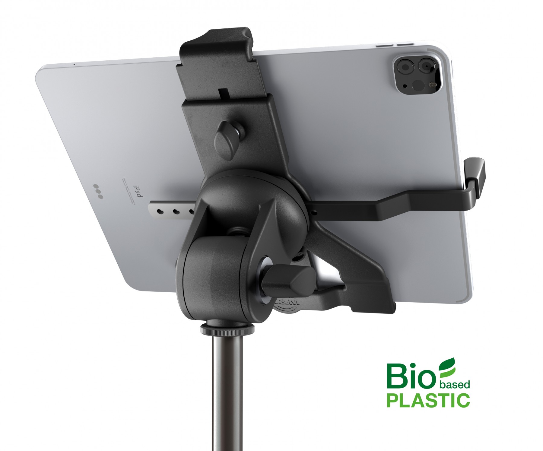 The combination of tablet PC stand holder and 3-piece extendable stand can be used at home, in the studio or on stage. The tablet mount is made of bio-based plastic. These plastics contain a proportion of over 50% up to 100% of renewable plant-based raw materials. The use of renewable raw materials helps to conserve limited petroleum resources and reduce harmful CO2 emissions. More info on bio-based plastics at: bioplastic.k-m.de. The stand can be folded in a space saving manner for easy transport. The universal tablet holder offers a practical clamping mechanism for all tablets with an approx. size of 10" to 16". The clamping range is between 158 and 280 mm. The holder is also particularly suited for tablets with a protective cover or case up to 18 mm thickness. The overlapping clamping jaws with integrated rubber pads guarantee a secure hold and eliminate unwanted vibration noise. The function of the operating elements on the device is not impaired. An adjustable mounting bracket with felt padding provides additional safety when the tablet holder is positioned vertically, preventing the tablet PC from falling out even under heavy use. The holder is infinitely adjustable and allows each user to position it individually. The tablet holder can be rotated between portrait and landscape format without further ado, whereby independent turning is prevented.
