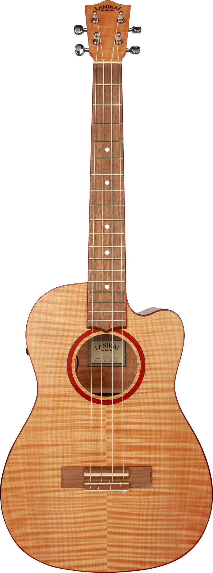 Size: Baritone Scale: 514mm Frets: 18 Cutaway: Yes Nut width: 38.8mm Top, back and sides: Flame Maple Neck: Okoume Fingerboard and bridge: Laurel Tuners: Chrome open back Preamp: Fishman Kula with tuner Nut and saddle: Graph Tech NuBone XB Strings: D'Addario EJ88B Binding and rosette: Bloodwood Finish: Natural, satin Note: Due to the slightly longer scale length LANIKAI utilizes a Truss rod on all Baritone models for easy action adjustments with bag - Additional Information