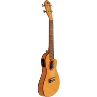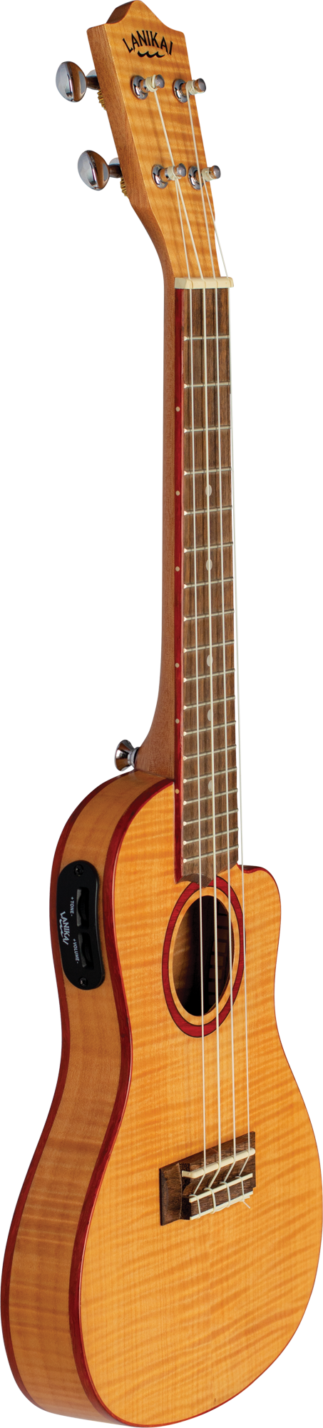 Size: Concert, thin Scale: 378mm Frets: 17 Cutaway: Yes Nut width: 37.4mm Top, back and sides: Flame Maple Neck: Okoume Fingerboard and bridge: Laurel Tuners: Chrome open back Preamp: LANIKAI Active Vol and Tone Nut and saddle: Graph Tech NuBone XB Strings: D'Addario EJ88T Binding and rosette: Bloodwood Finish: Natural, satin with bag - Additional Information