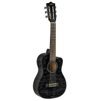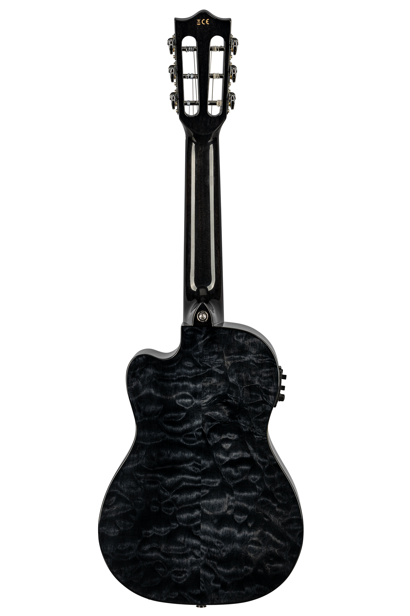 • Size: Guitalele • Top, back and sides: Quilted Maple • Cutaway: Yes • PreAmp: Fishman Kula with Tuner • Nut width: 43 mm • Scale: 473 mm • Frets: 15 • Fingerboard: Laurel • Tuners: Grover Nickel, open back • Nut and saddle: Graph Tech NuBone XB • 2 Chrome strap buttons • Strings: Aquila • Binding: Black multiply ABS • Rosette: Abalone • Finish: Gloss, Black • with Foam Case - Additional Information