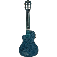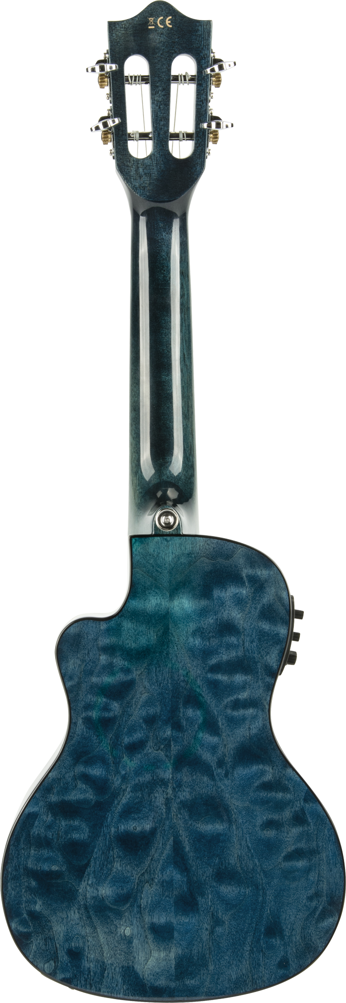 Size: Concert Scale: 378mm Frets: 18 Cutaway: Yes Nut width: 37.4mm Top, back and sides: Quilted Maple Neck: Okoume Fingerboard and bridge: Laurel Tuners: Grover nickel open back Preamp: Fishman Kula with tuner Nut and saddle: Graph Tech NuBone XB Strings: D'Addario EJ88 Binding: Black Rosette: Abalone Finish: Blue, gloss with softcase - Additional Information