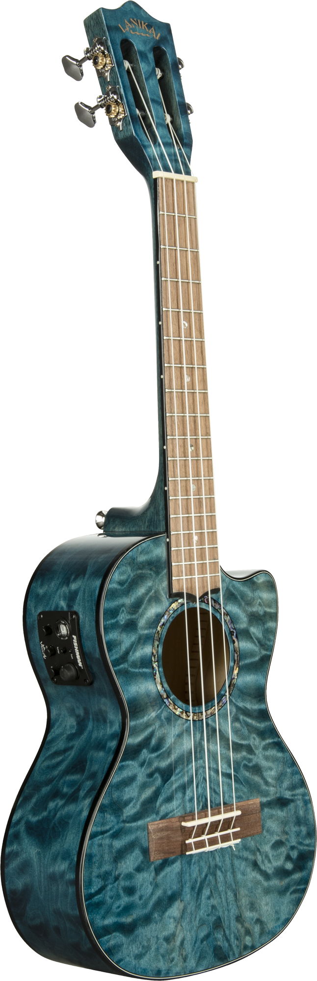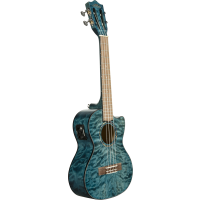 Size: Tenor Scale: 432mm Frets: 17 Cutaway: Yes Nut width: 37.4mm Top, back and sides: Quilted Maple Neck: Okoume Fingerboard and bridge: Laurel Tuners: Grover nickel open back Preamp: Fishman Kula with tuner Nut and saddle: Graph Tech NuBone XB Strings: D'Addario EJ88T Binding: Black Rosette: Abalone Finish: Blue, gloss with softcase - Additional Information