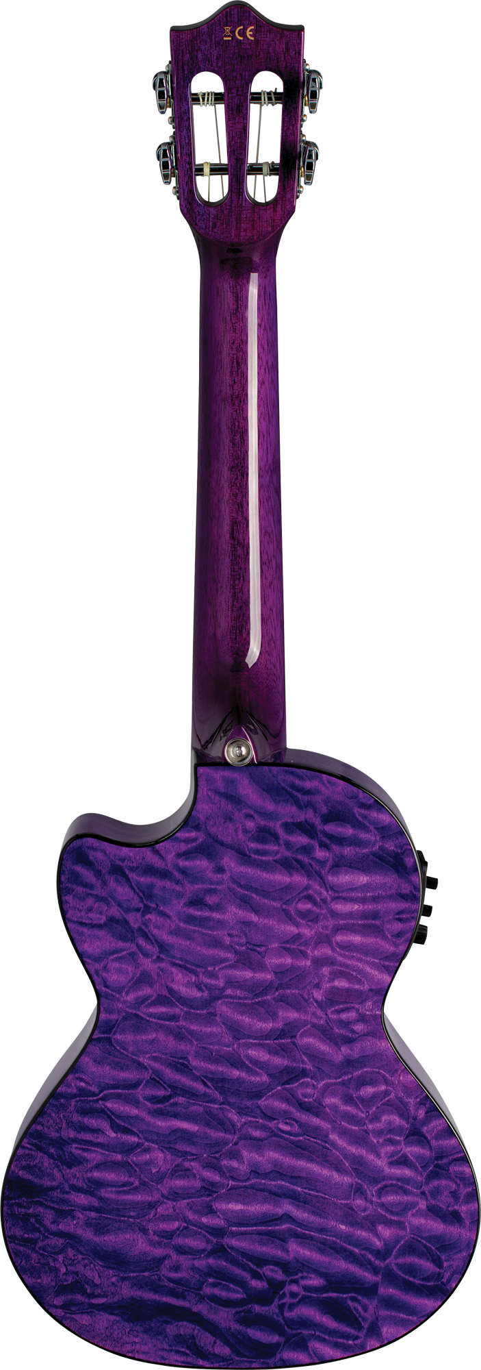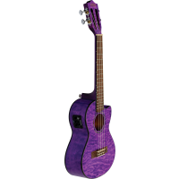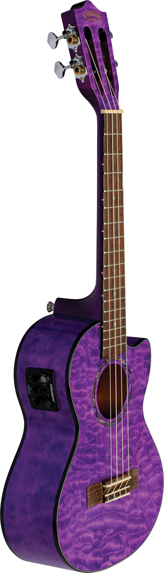 Size: Tenor Scale: 432mm Frets: 17 Cutaway: Yes Nut width: 37.4mm Top, back and sides: Quilted Maple Neck: Okoume Fingerboard and bridge: Laurel Tuners: Grover nickel open back Preamp: Fishman Kula with tuner Nut and saddle: Graph Tech NuBone XB Strings: D'Addario EJ88T Binding: Black Rosette: Abalone Finish: Purple, gloss with softcase - Additional Information
