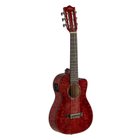 • Size: Guitalele • Top, back and sides: Quilted Maple • Cutaway: Yes • PreAmp: Fishman Kula with Tuner • Nut width: 43 mm • Scale: 473 mm • Frets: 15 • Fingerboard: Laurel • Tuners: Grover Nickel, open back • Nut and saddle: Graph Tech NuBone XB • 2 Chrome strap buttons • Strings: Auila • Binding: Black multiply ABS • Rosette: Abalone • Finish: Gloss, Black • with Foam Case - Additional Information